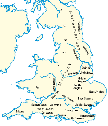 After the first few centuries the myriad of colonies and settlements had merged into what is usually identified as seven more permanent kingdoms. These were the kingdoms of Northumbria, Mercia, East Anglia, Essex, Kent, Sussex and Wessex. The Roman-British were now pushed west into Wales, Cornwall, the Scotish Borders, Lancashire and Cumbria. This process of amalgamation into these larger kingdoms was ongoing but by about AD 800 this is what England looked like: